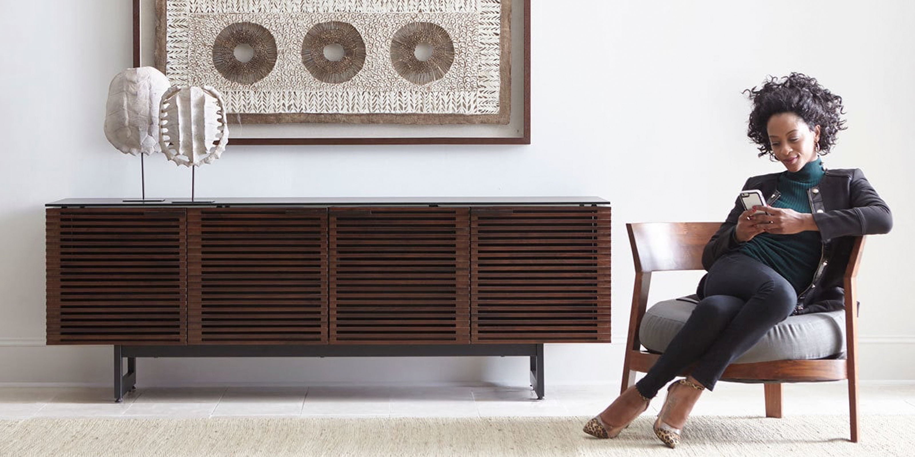 The 8477 Profile console offers versatile functionality with ventilated cord management openings, convenient cord wraps, and a TV strap for safety. Its oak hardwood slatted doors provide ventilation, acoustic transparency, and remote control accessibility, while flexible tempered glass shelving adjusts to accommodate AV components and personal treasures. Enhance your living space with the timeless and contemporary 8477 Profile™ Media and Storage Console.